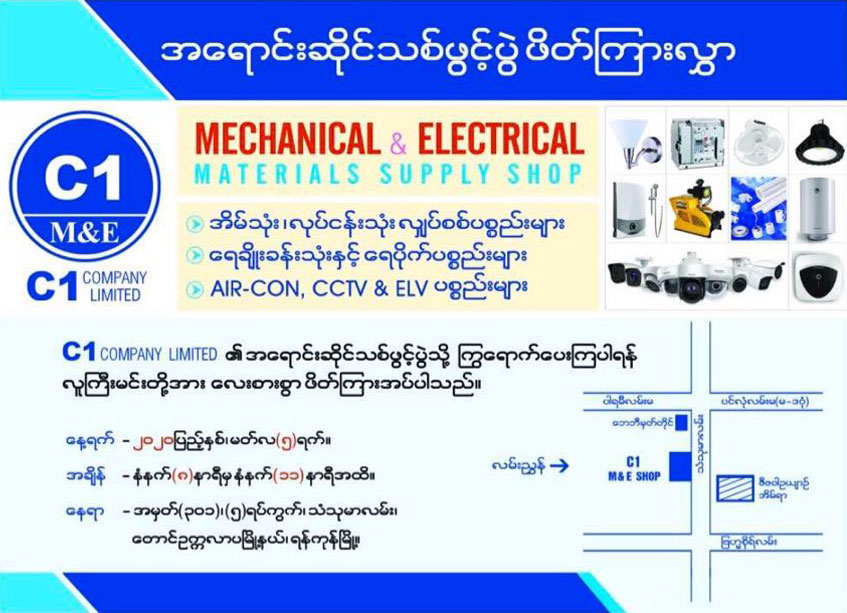 C1 MECHANICAL &ELECTRICAL MATERIALS SUPPLY SHOP (2) ဆိုင်သစ်ဖွင့်ပွဲ ကိုအောက်ပါအစီအစဉ်အတိုင်း ပြုလုပ်မည်ဖြစ်ပါသဖြင့် မိတ်ဆွေအားလုံးကြွရောက်ပေးကြပါရန် လေးစားစွာဖြင့်ဖိတ်ကြားအပ်ပါတယ်။